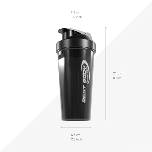 Details: Best Body Nutrition Eiweiß Shaker schwarz – 600 ml Protein Shaker mit Sieb & Mess-Skala – auslaufsicher – spülmaschinengeeignet – BPA-frei – für klumpenfreie Proteinshakes