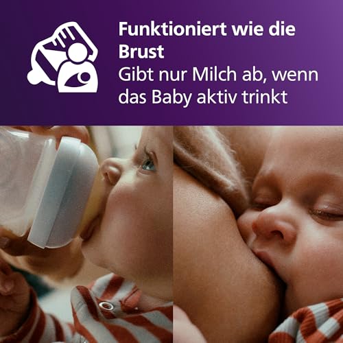 Entspricht dem Stillen an der Brust¹: Der Sauger gibt nur dann Milch ab, wenn Ihr Baby trinkt. Dies unterscheidet sich von den herkömmlichen Saugern mit freiem Nahrungsfluss. Wie beim Stillen kann es einige Zeit dauern, bis sich Ihr Baby daran gewöhnt hat