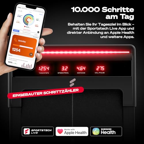 𝗜𝗻𝗻𝗼𝘃𝗮𝘁𝗶𝘃𝗲 𝗔𝗽𝗽-𝗔𝗻𝗯𝗶𝗻𝗱𝘂𝗻𝗴 – Machen Sie mehr aus Ihrem Laufband mit der Sportstech Live App und sichern Sie sich eine Ersparnis von 132 €. Tauchen Sie ein in mitreißende Trainingsvideos, genießen Sie traumhafte Landschaften und lassen Sie sich von individuellen Plänen begleiten – während die smarte Schrittzählerfunktion jeden Ihrer Erfolge sichtbar macht und Sie Schritt für Schritt motiviert.
