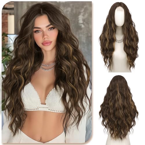 Sofeiyan Gewellte Wellig perücke,70 cm Lange Dunkelbraun mit golden Strähnchen Mittelscheitel Damen Perücken,Hitzebeständige Synthetische Haar Lockige,Natürliche Frauen Wig für Alltag,Cosplay,Karneval