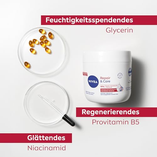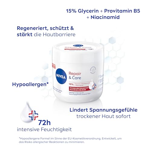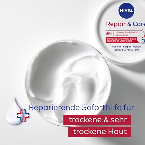 Sofortige Linderung von Spannungsgefühlen trockener Haut mit der NIVEA Repair & Care Creme: die hypoallergene* Formel ist angereichert mit 15% Glycerin, Provitamin B5 und Niacinamid. Die effektive Formel repariert und pflegt die Haut intensiv und lindert Spannungsgefühle sehr trockener und rauer Haut sofort. Sie regeneriert, schützt und stärkt die Hautbarriere, um Feuchtigkeitsverlust zu verhindern, und bietet der Haut langanhaltenden Schutz. Ihre leichte Textur zieht schnell ein und fettet nicht – für seidig-weiche, gesund aussehende Haut und bis zu 72h intensive Feuchtigkeit. Genießen Sie die beruhigende Wirkung dieser Pflege, die Ihre Haut pflegt und schützt. Für einen Effekt, den Sie nicht nur sehen, sondern auch fühlen können.