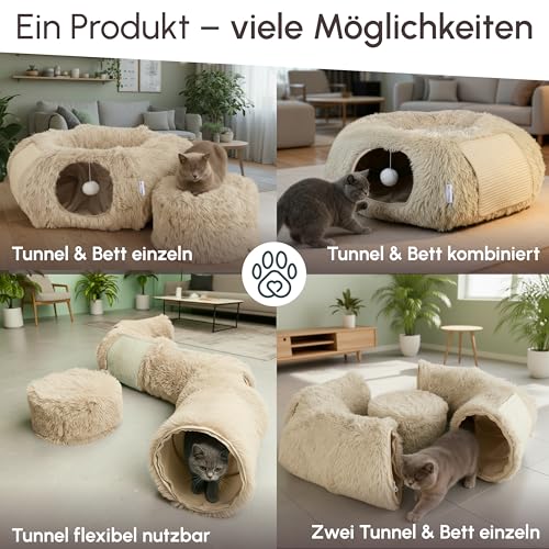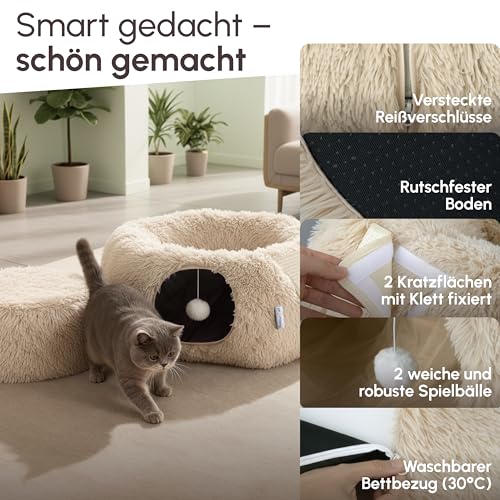 3-in-1 Katzentunnel mit Katzenbett & Kratzflächen | Flexibel nutzbarer Premium Katzentunnel aus weichem Plüsch als Katzenhöhle, Katzenkorb & Katzenspielzeug | Waschbar | Mit Sisal Kratzmatte | BEIGE