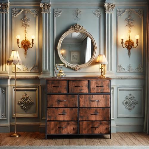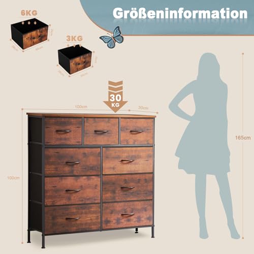 DUMOS Kommode mit Schubladen – Kommoden&Sideboards für Schlafzimmer Geeignet, Komodenschrank mit 9 Schubladen, Stoffkommode mit Stabilem Stahlrahmen, Ideal für Schlafzimmer, Wohnzimmer (Vintagebraun)